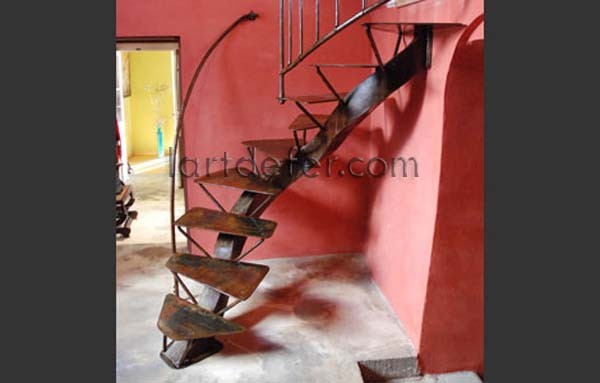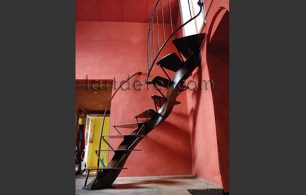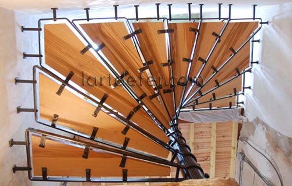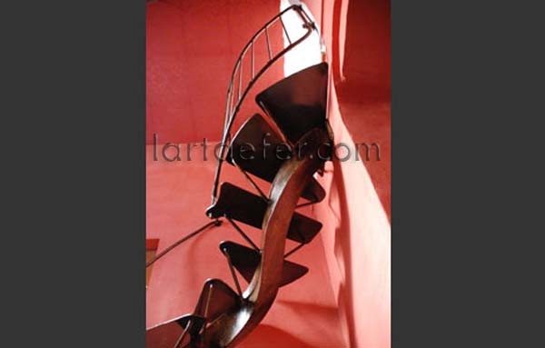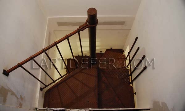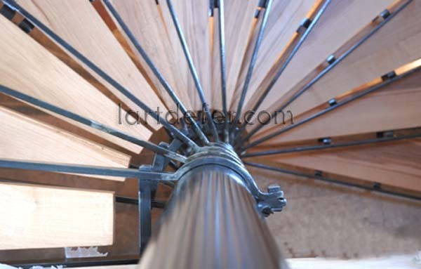 Escalier en colimaçon fer et bois. Les marches en bois cerclées de fer s'enroulent autour du poteau central.