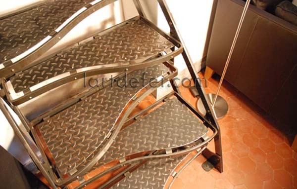 Ouvrage de métallerie, deux limons latéraux en tube accueillent les marches en tôle larmée.