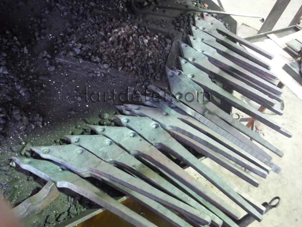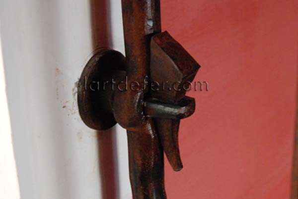 Le garde corps est repris sur le poteau central par la lice haute. Les barreaux ronds sont assemblés par trous renflés et rivets à chaud.