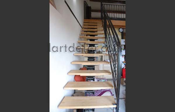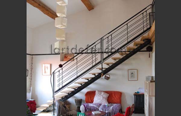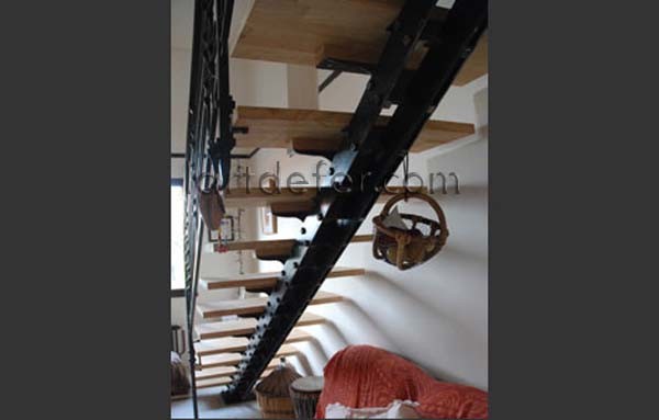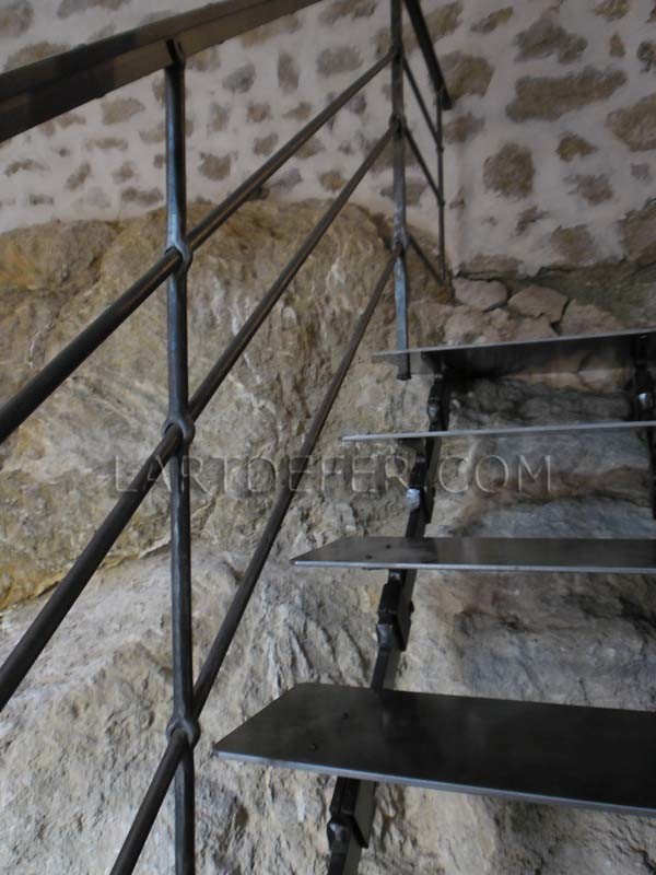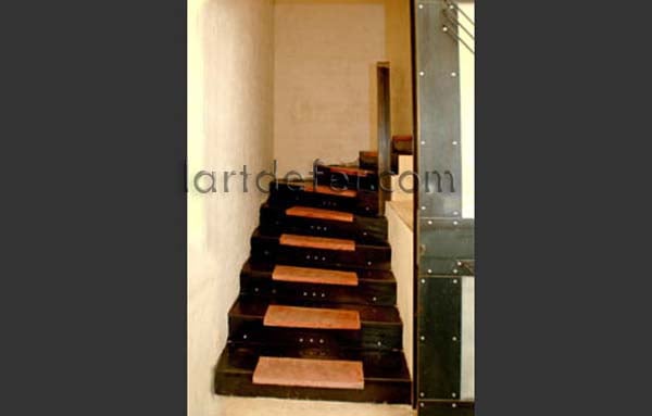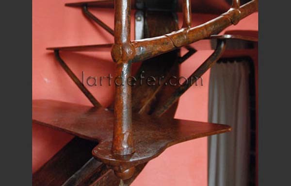 Les marches en bois sont enchâssées dans les limons. Un simple poteau martelé et repoussé à son sommet sert de départ.