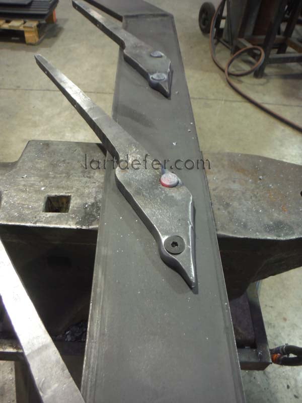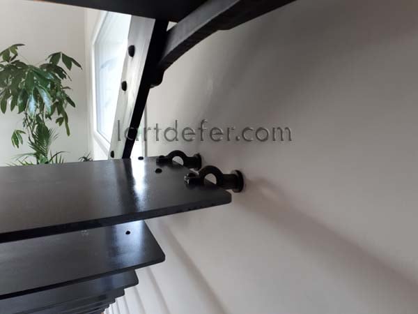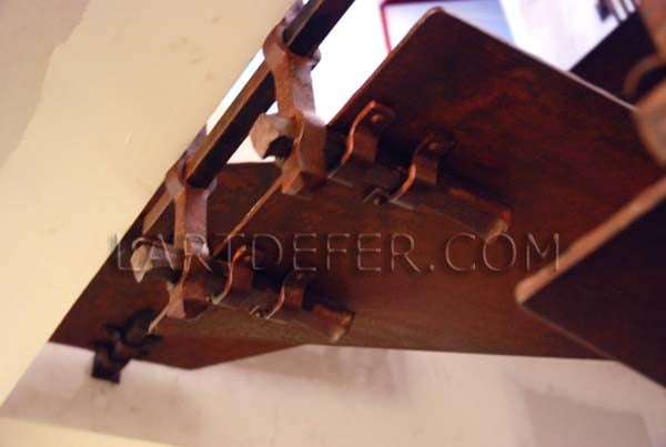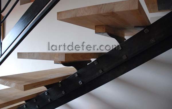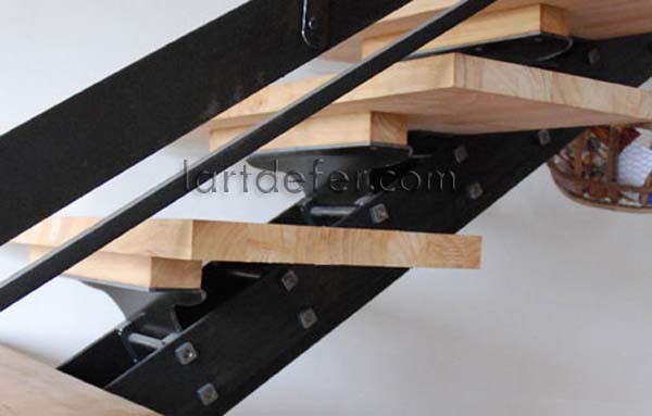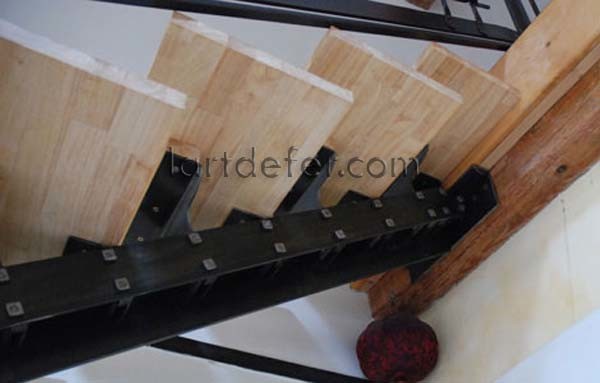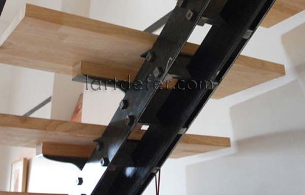 Les marches sont fixées sur les limons par des clavettes et liens formés à chaud.