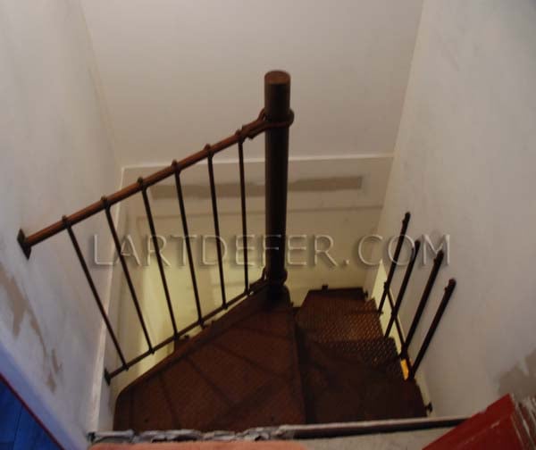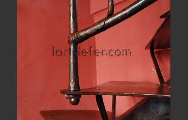 Escalier, rampe et garde corps tout en acier forgé. Les marches de cet escalier en colimaçon sont fixées sur un poteau central et reprises sur les murs de la cage d'escalier. Les marches en tôle sont assemblées par un système de clavettes, de trous renflés et de tenons et mortaises.